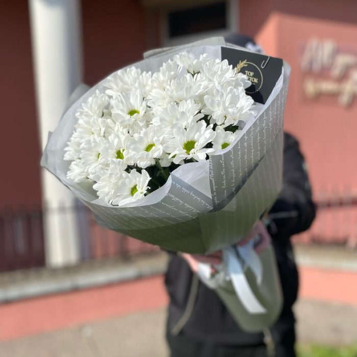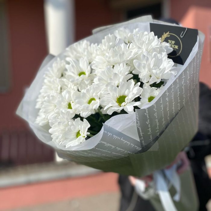 Тишью – 1 шт. Атласная лента – 1 шт. Ромашковая хризантема – 5 шт. Дизайнерская упаковка – 1 шт.