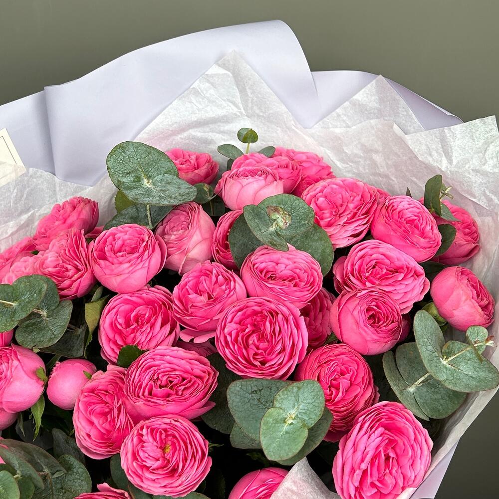 Эвкалипт – 7 шт.Пионовидная роза – 11 шт.Дизайнерская упаковка – 1 шт.