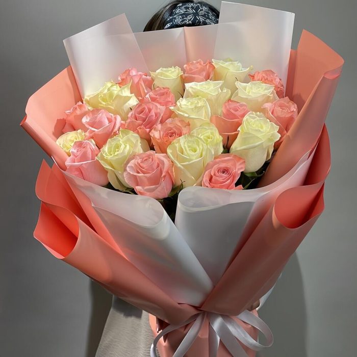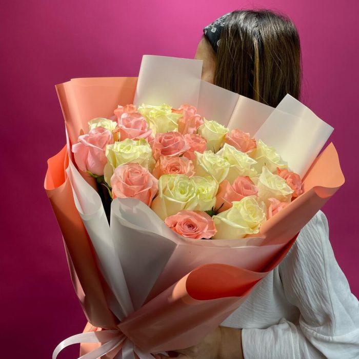 Микс букет из Голландских роз ,персикового и белого оттенков ,высота роз 50-60 см.Высота букета 65-70 см.