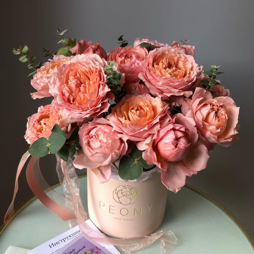Пионовидные розы розово-персиковых оттенков с ароматным эвкалиптом Флористы студии Peony собрали данную композицию с огромным трепетом из самых свежих цветов Цветы в коробке – это удобно, так как для них не нужна ваза. Цветы находятся в специальной флористической губке, которую необходимо поливать раз в два дня В подарок к композиции прилагается открытка с вашими пожеланиями и инструкция по уходу за цветами.