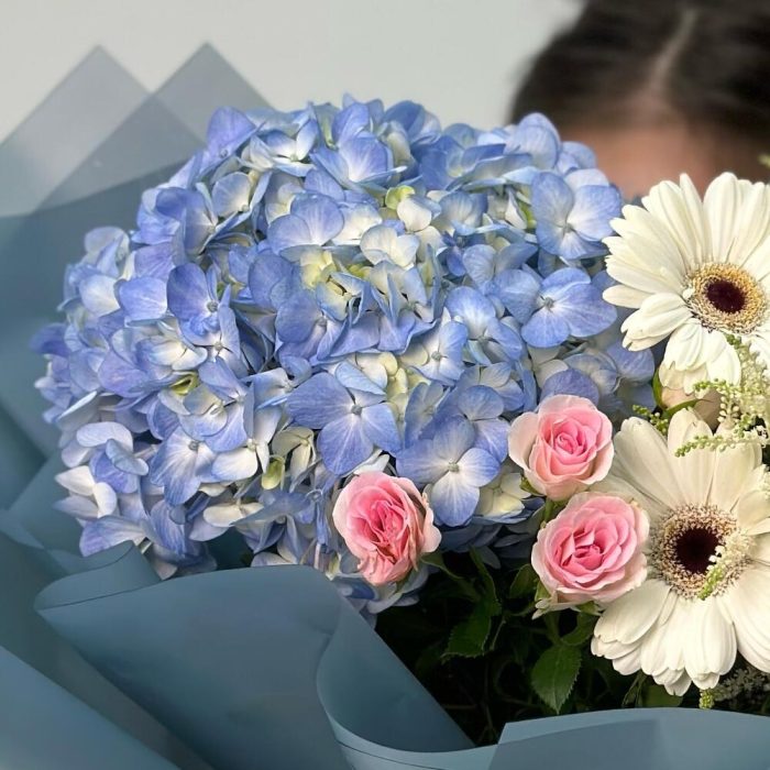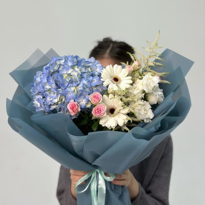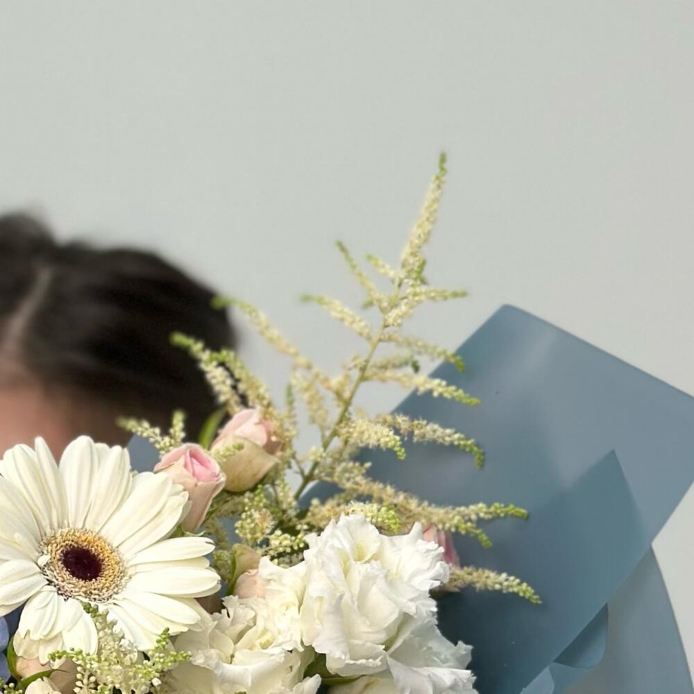 Астильба – 1 шт. Гортензия – 1 шт. Кустовая роза – 2 шт. Эустома – 1 шт. Гербера – 2 шт.